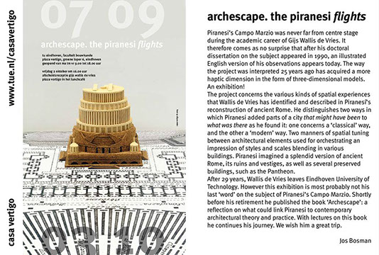 archescape, the piranesi flights Afscheidsexpositie voor Gijs Wallis De Vries. Onderzoek naar Piranesi en de vluchtlijnen, interpreteren teksten, beelden en Campo Marzio van Piranesi, aan de hand daarvan het ontwerpen van de 8 gebouwen/ruimtelijke elementen. Expositie ontwerpen en maken Samen met Manon Deijkers, Christian Hazeleger en Jorrit Klaver. Met hulp van Jos Bosman en Gijs Wallis De Vries