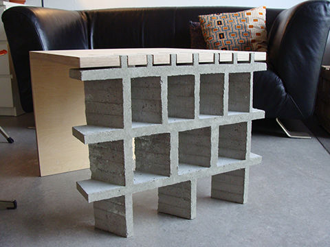Concrete design competition, production and parts modular furniture is een ontwerp dat voortborduurt op dezelfde vormentaal. met verschillende stapelbare betonnen elementen en inschuifbare planken