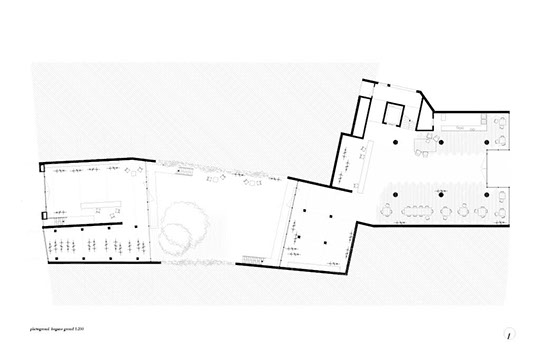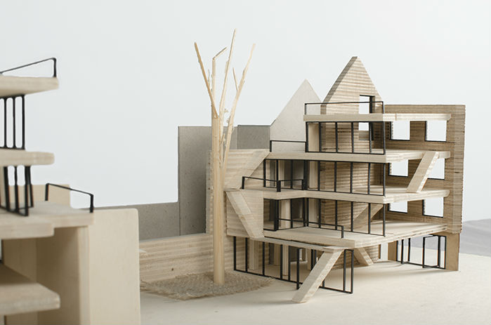 Het uiteindelijke ontwerp is een specifiek ensemble van gebouwen in een bouwblok in Heerlen. Een specifiek deel van de uitbreiding van het stadscentrum in de jaren ’30 heeft vanaf dag 1 mijn aandacht gegrepen, namelijk Pand Kneepkens. In het bouwblok waar Pand Kneepkens deel van uitmaakt, zijn meerdere (deels) leegstaande panden. Een aantal van deze gebouwen ligt aan de Akerstraat. De vroegere verbinding van Pand Kneepkens met het in 1989 gesloopte voormalig ‘Magazijn De Zon’ én het feit dat min of meer tegenover Pand Kneepkens een aantal panden deels leegstaat, was voor mij reden om mijn speldenprik door te trekken, het bouwblok in en door, tot aan Akerstraat 18 en 18a. Op de plek waar de ‘oude’ Akerstraat en het moderne stadscentrum uit de jaren ’30 elkaar tegenkomen in één bouwblok, een typische Heerlense ontmoeting, is mijn ingreep een impuls voor deze plek. Het fietshotel, de werkplaats, fietsenwinkel en –verhuur, de appartementen waarin oud en nieuw elkaar ontmoeten, de vele buitenruimtes; samen vormen zij het ensemble dat in dit specifieke bouwblok in Heerlen de speldenprik vormt, de pijnpunten aanpakt en het een bijzondere plek in de stad geeft.